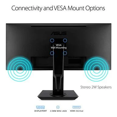 ASUS VP348QGL gaming monitor features 34-inch UWQHD (3440 x 1440) 21:9 aspect ratio with wide viewing angle, delivers immersive viewing experience. 75Hz refresh rate with Adaptive-Sync/FreeSync technology to eliminate screen tearing and choppy frame rates for even more seamlessly smooth gameplay.