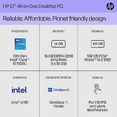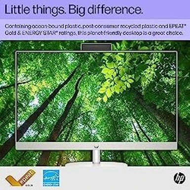 - MADE WITH THE PLANET IN MIND – The HP 27 inch All-in-One Desktop PC is responsibly manufactured using post-consumer recycled and ocean-bound plastics and is EPEAT Gold Registered and ENERGY STAR Certified