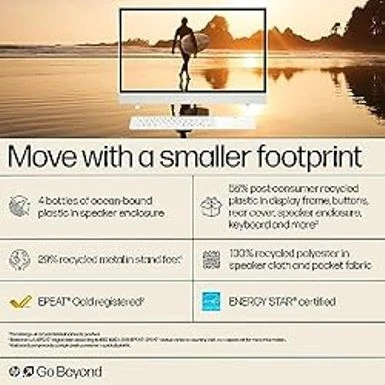 - Built INTEL UHD GRAPHICS – Smoothly stream 4K content and play your favorite games in 720p a better tomorrow:The better choice for a brighter tomorrow, HP Envy Move is sustainably designed using postconsumer recycled plastic,(63f)recycled metal in the feet,(63d)and recycled polyester in the speaker cloth and fabric pocket.(63h)And with an EPEAT Gold(27) and ENERGY STAR certified design, you can be confident your PC does good things for the planet, while doing amazing things for you.