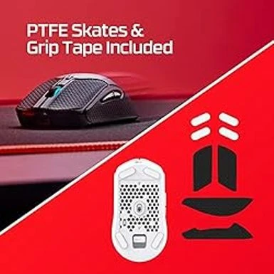 - Virgin PTFE skates and custom HyperX Grips: Have ultimate confidence in your control with the smooth effortless glide of 100% virgin-grade PTFE skates, and 4 pieces of custom, residue-free HyperX grips to help provide a secure hold.