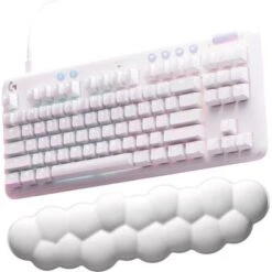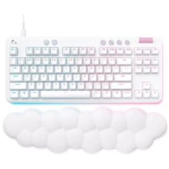 - Float away with G713’s dreamy white design and comfy, cloud-shaped palm rest; compact mechanical TKL keyboard layout and adjustable height give that good game feeling, all-day long.